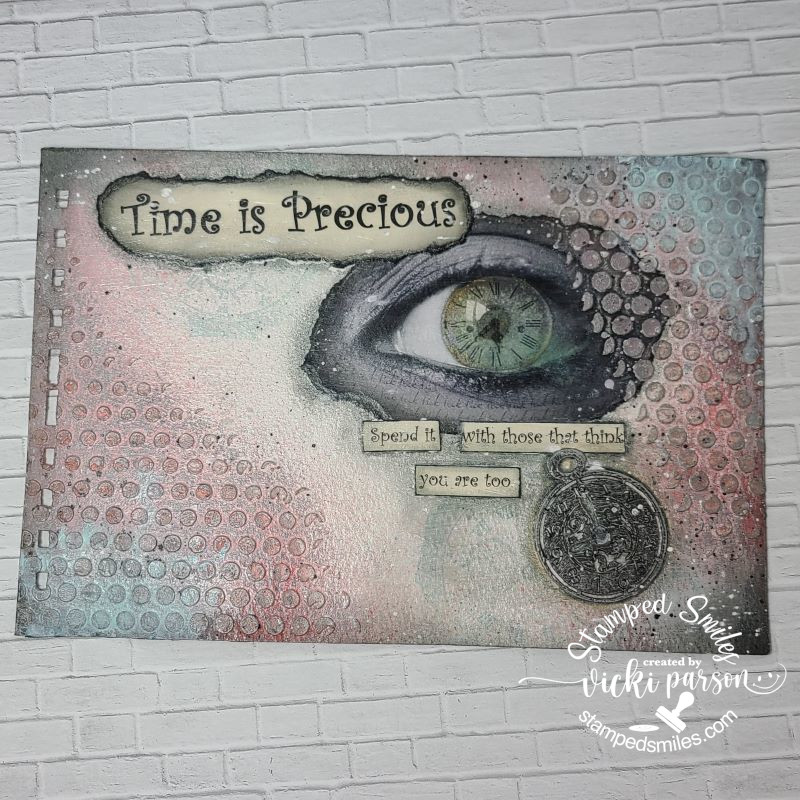 I found a cool photo online of the eye with the clock.  The outside of the eye has repetitive “tick tock” wording over it.  Before attaching this photo and the wording elements, I stamped a very large pocket watch image (Whimsy Stamps retired) with Speckled Egg Distress Oxide ink.  Since the sprays and ink are water based media, I covered the page with Distress Micro Glaze to make it permanent before adding some collage medium to attach the other elements. I also used a Big Brush marker to go around the edges for shadows. The pocket watch detail is a laser cut chipboard that was sprayed with black distress spray.