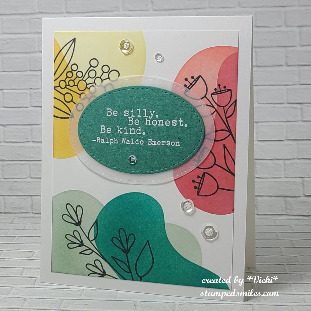 For the background, I used a My Favorite Things “abstract” stencil and blended over it with several different colors. I then took a couple of the floral images from the stamp set and stamped over the stenciled “blobs”. I then white heat embossed one of the quotes from the stamp set and cut it out with a stitched oval die and then layered another stitched oval vellum layer behind it. I popped it up with foam tape over the center of the background and then attached the entire layer over a white top folding A2 card base. Lastly, I added some clear sequins with Stickles in the center of each one.