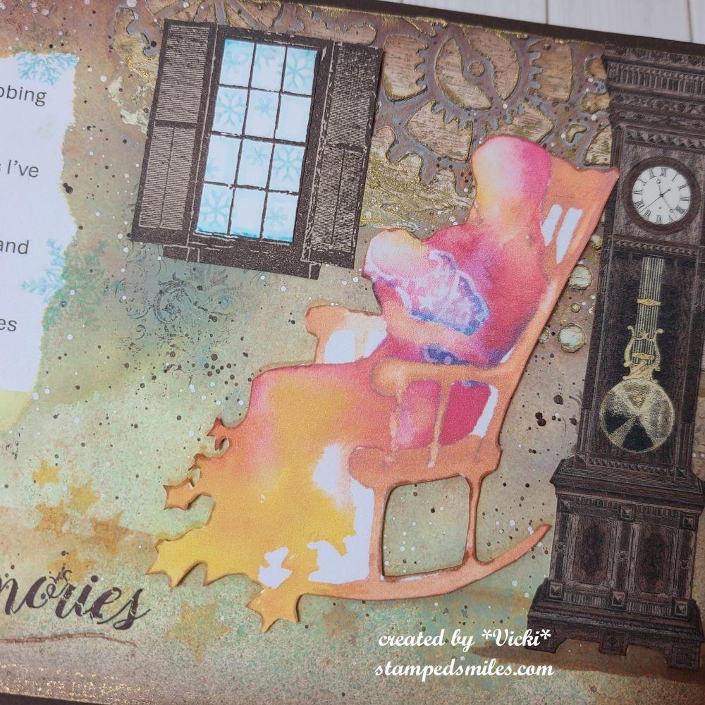 I thought that the “memories” prompt would be a good one to use for the end of the year. It’s a way for me to reflect back at all of the memories that were made throughout the year. Plus, with the winter weather outside, it’s a good time to stay indoors where it’s warm and rock a baby perhaps!😉 When my new grandson came over, it was a pleasure to rock him in the very same rocking chair that I had rocked my children in as well! This brought up special memories of my grown children now with their own baby! So I made a scene with winter outside, rocking my baby and the grandfather clock I have next to it. (Which is a similar scene from my home.)