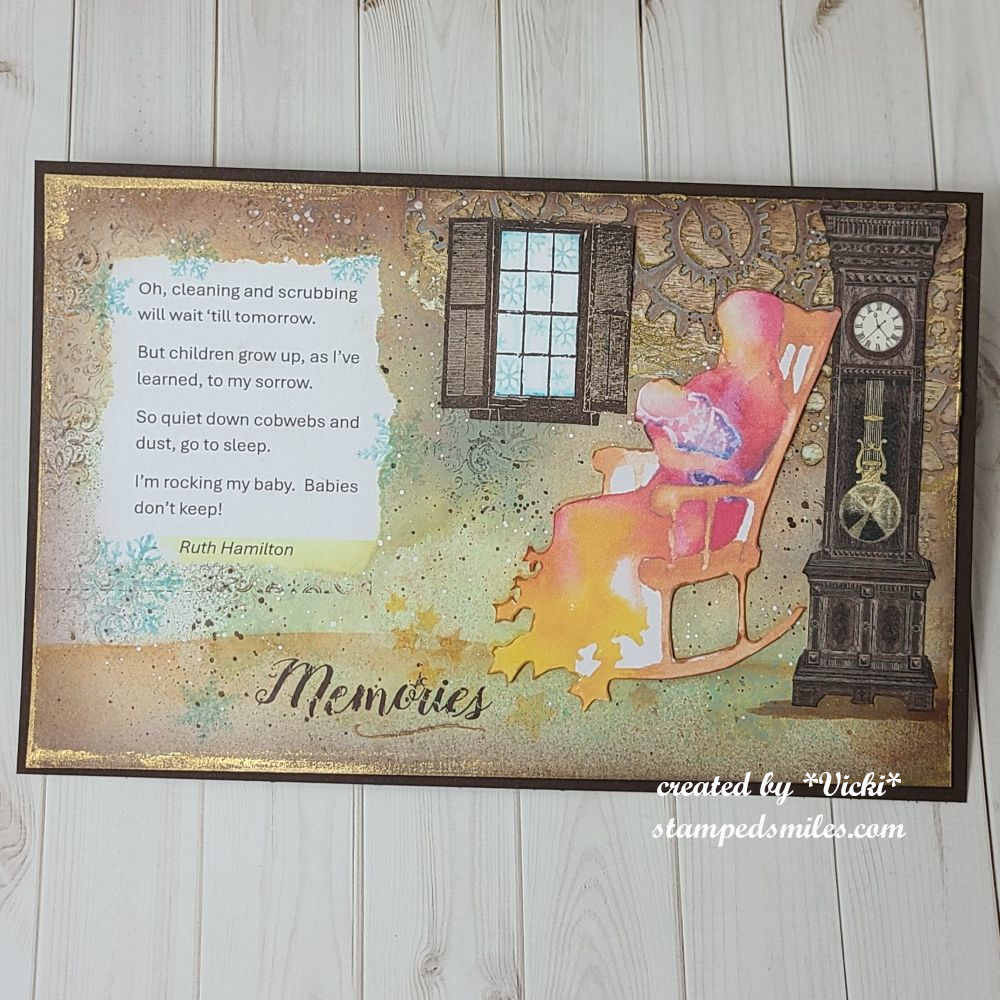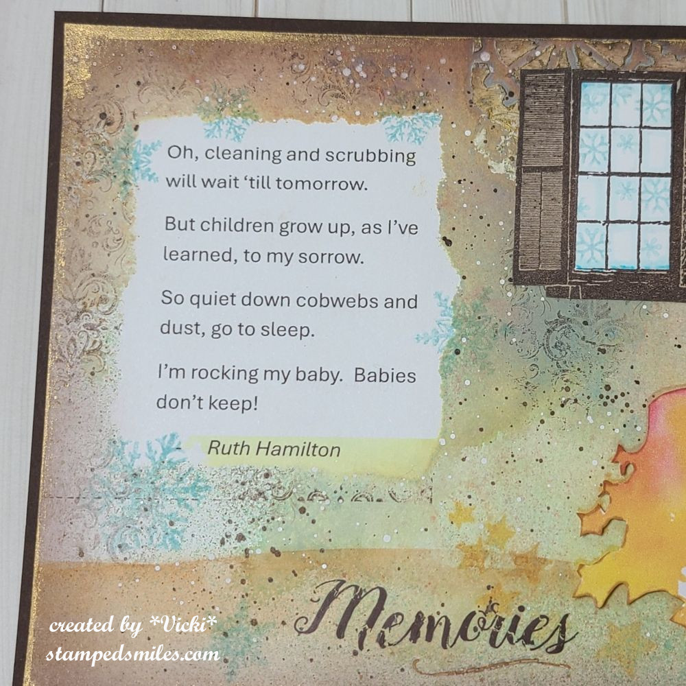 Awww, what a beautiful page, my friend! I love that you incorporated rocking that sweet lil’ grandson in the same chair you rocked your kids into your Memories page. And that poem is awesome! I’m sure going to miss seeing these every month. Believe it or not, you’ve given me a lot of inspiration for some pages when I finally find my journal, lol! I ‘think’ I know where to look and I’m going to check that box today. Still have lots of boxes of cards and 3D projects to go through from our move so I can get started on donating all the cards. But I really do love this page and it really reflects some beautiful memories! Happy New Year!