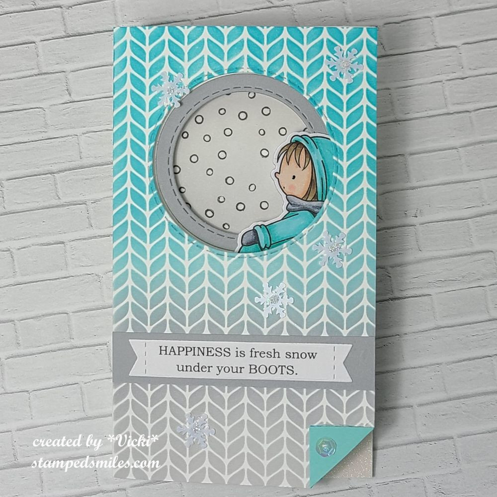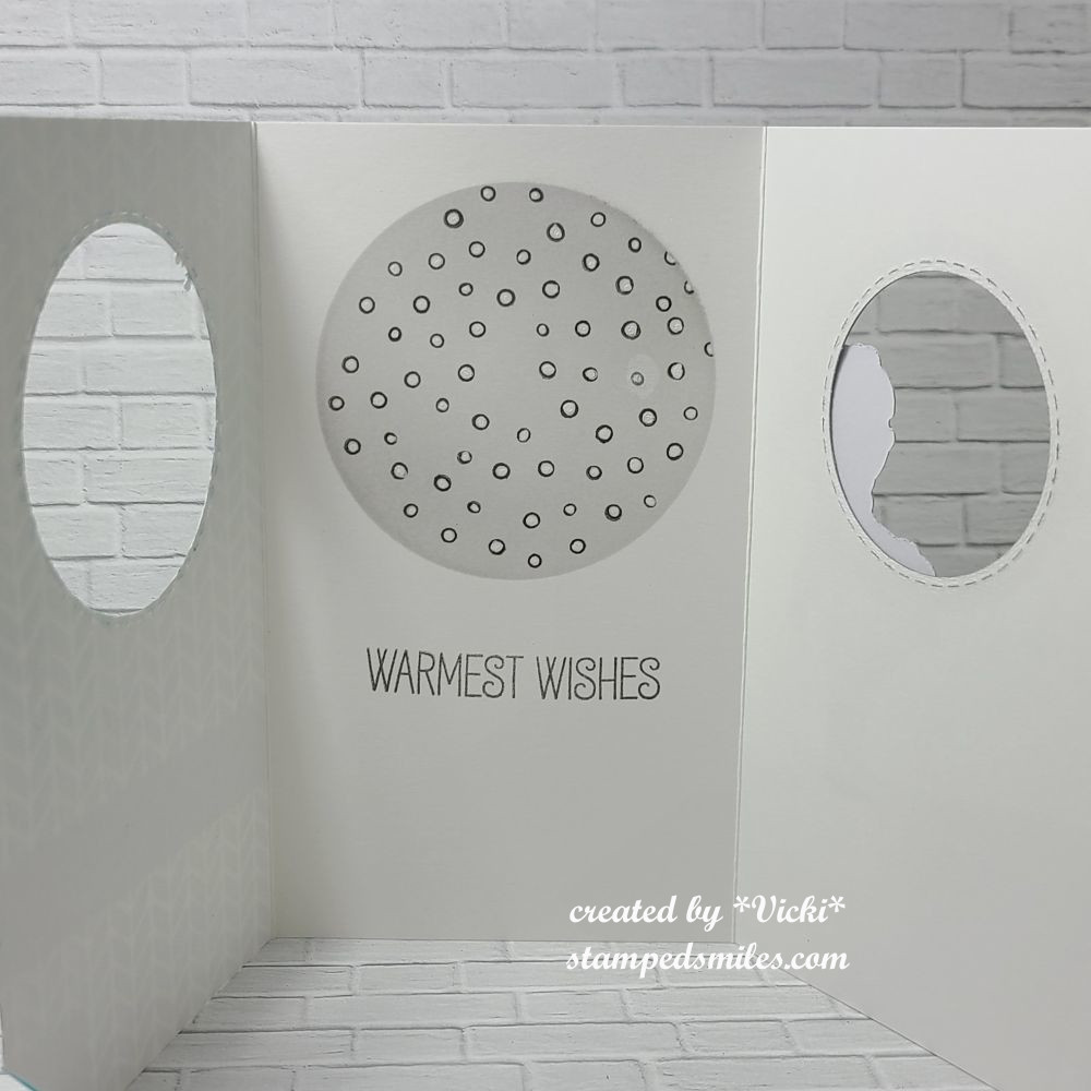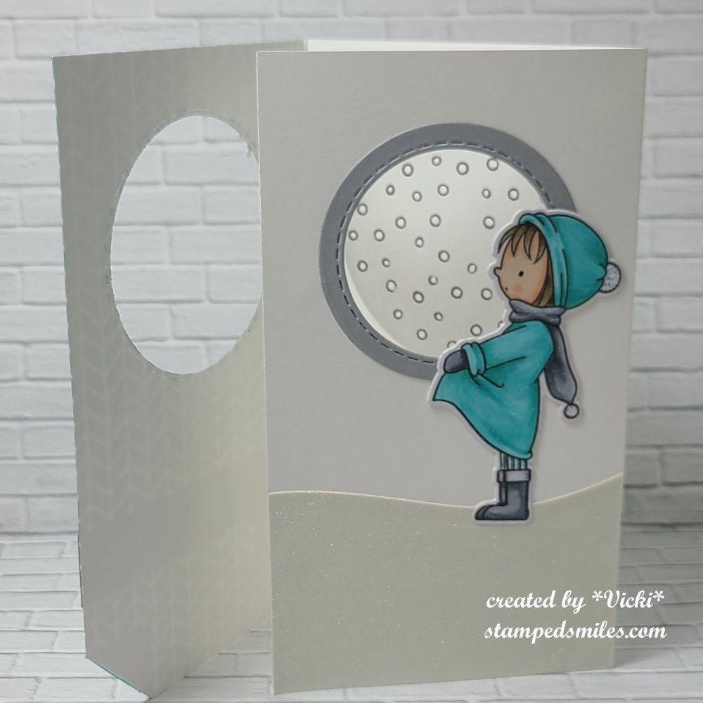 I used a circle die to cut the openings and added a snow drift from glitter cardstock for the girl to stand on, on the inside panel. The last inside circle panel was stamped with a snowflake stamp and I colored the snowflakes with a white gel pen and then added a stamped greeting underneath it.