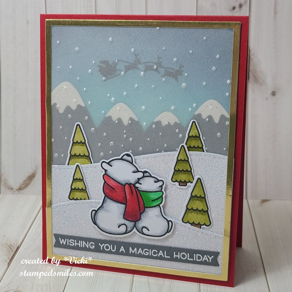 I ink blended a couple of blue colors for the main panel in the background, stamped the Santa and sleigh image in black and then arranged the mountain border. I added a piece of vellum and used a falling snow embossing folder over it before adding the snow hills with glitter cardstock over it. I covered the edges with a gold mirror cardstock frame and added to the red A2 top folding card base. I colored, cut out the critters and trees and placed them on the scene. Lastly, I white heat embossed the sentiment from the set and cut out with a banner die to place under the critters.