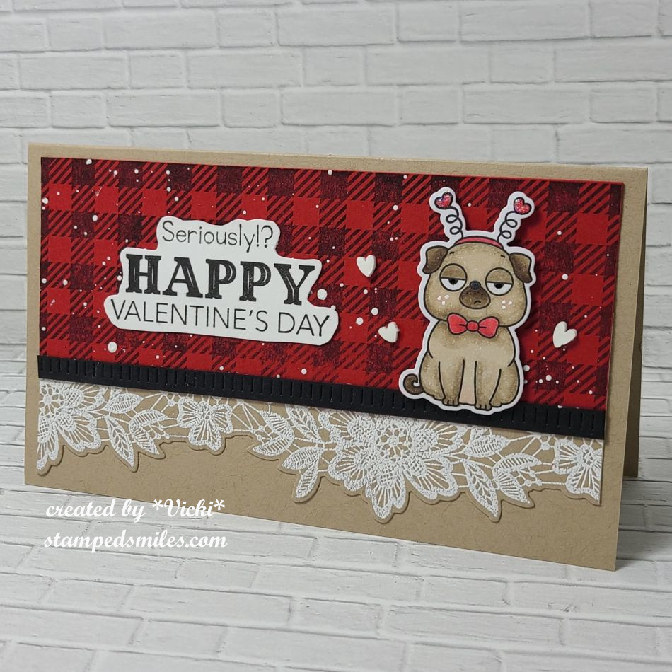 For the lace, I white heat embossed the border stamp from the TE Flip the Lace stamp/die (retired) over the Toffee cardstock and placed beneath the check background piece. I added a black strip between the two and then popped the dog on it. I stamped the “Seriously” from the pup stamp set and the Valentine greeting from the lace stamp set together and fussy cut them out to pop up with foam tape on the card. I added a few white hearts around the pup. The entire card is a mini slim from a pre-cut and scored Toffee card base.