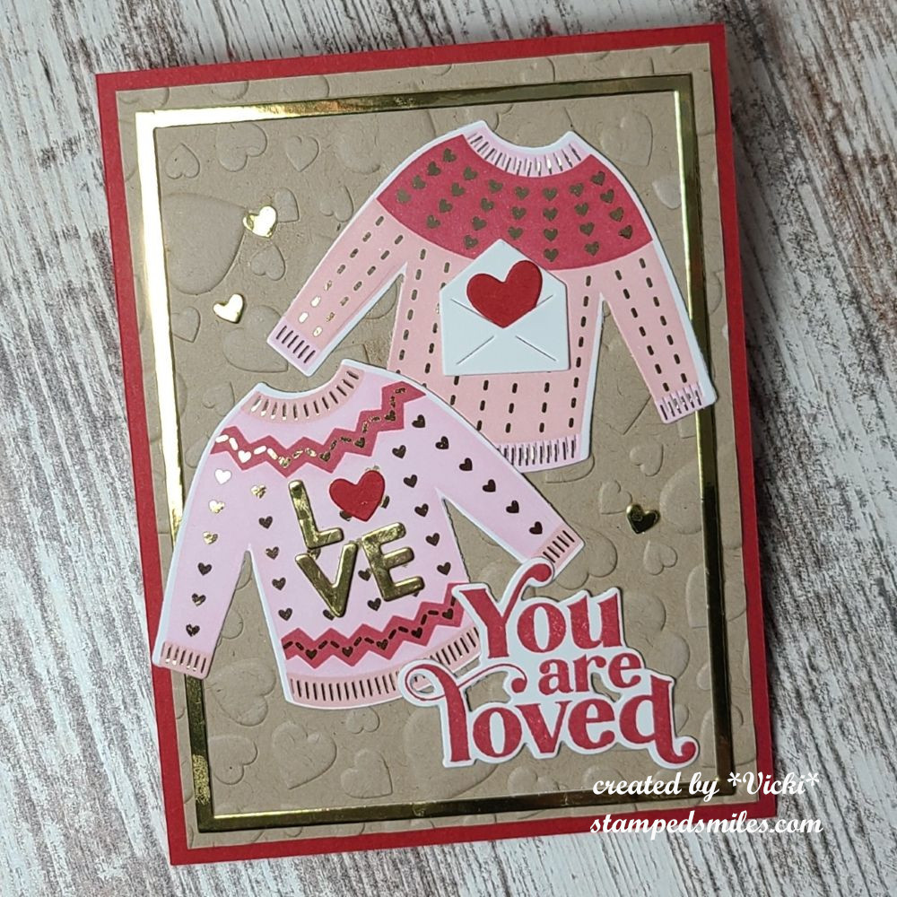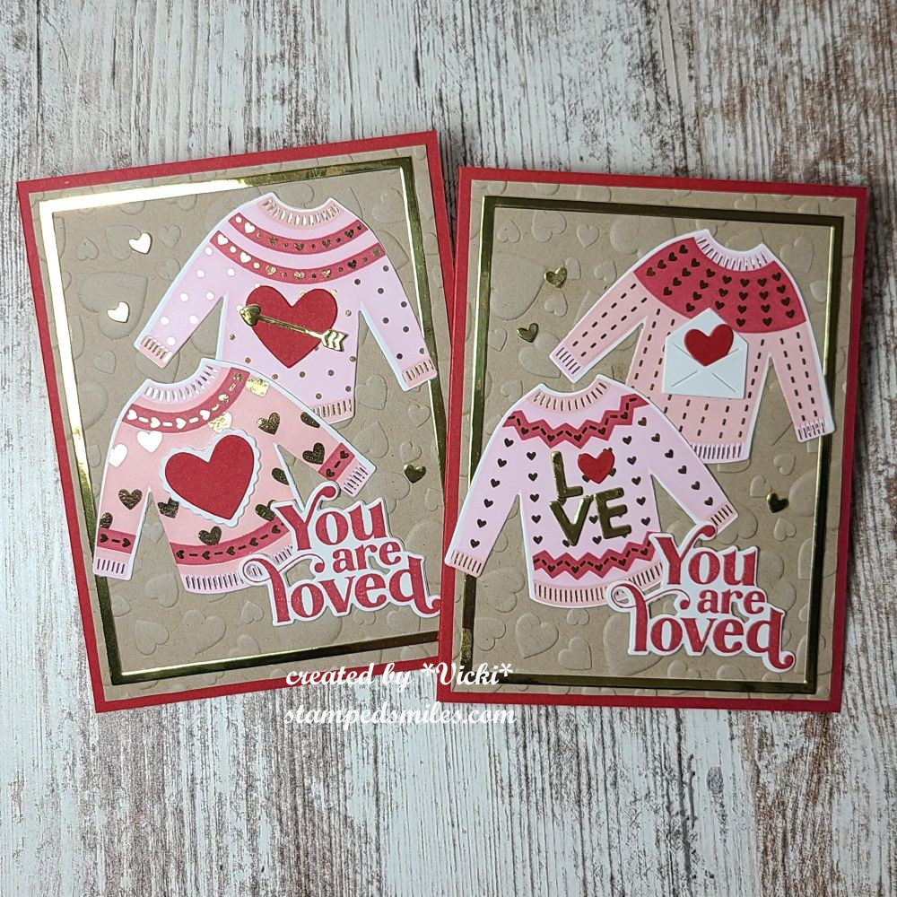 Aren’t these heart sweaters adorable?! I had fun making a couple of cards to send to my kids (whom I love) for Valentine’s Day. I was actually able to create two similar cards using a stencil set that allows you to make 4 sweaters at one time.