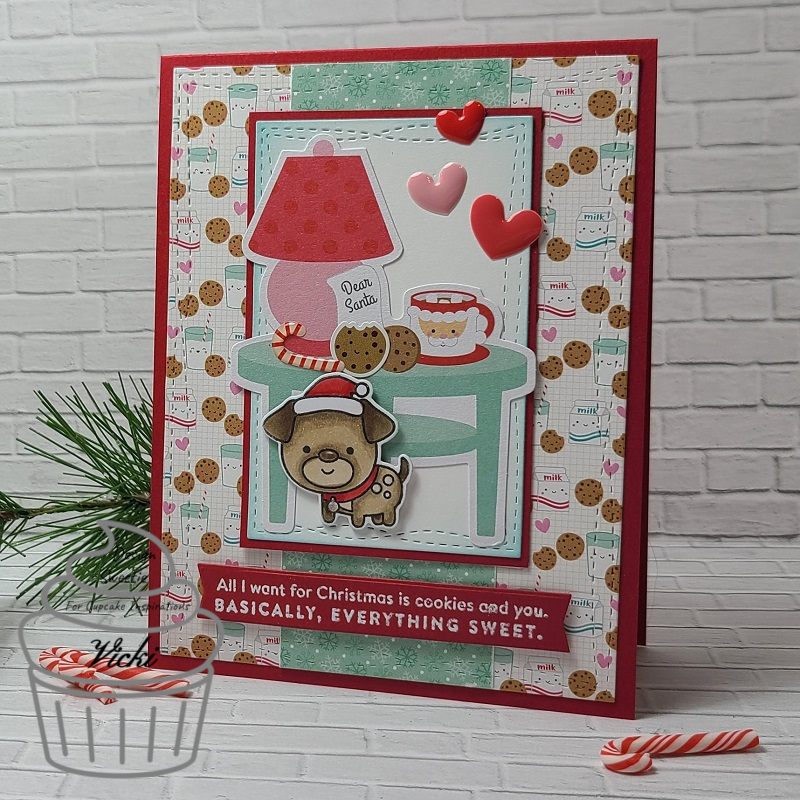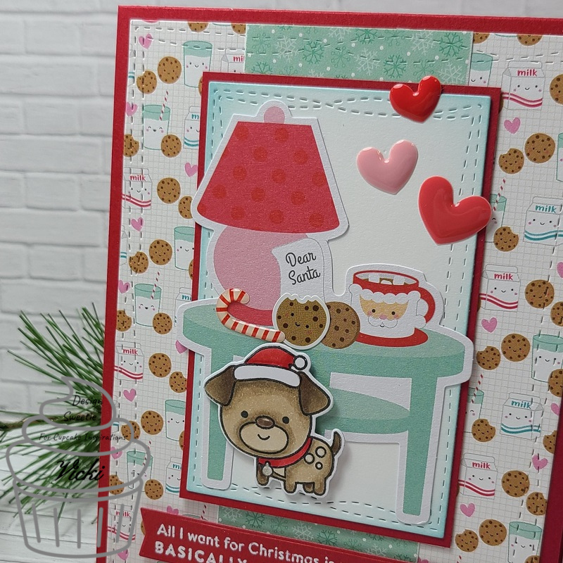 For the front of my envelope here: I thought it would be fun to create a little scene for my mouse gnome to hang up his stockings! I took a strip from the Doodlebug Buffalo Check/Wood Grain paper pack to place along the bottom and stenciled some bricks for the background. I stamped, colored and cut out the gnome with the coordinating die and I punched a small hole on each side of him where his hands are for the string. I then took some of the “stockings” from the Picket Fence Fireplace Stockings sequins and attached them to the string that wraps around the back of the scene panel. I added a sentiment from the same stamp set, popped up the gnome and attached to a piece of green glitter cardstock and then attached it to the envelope front.