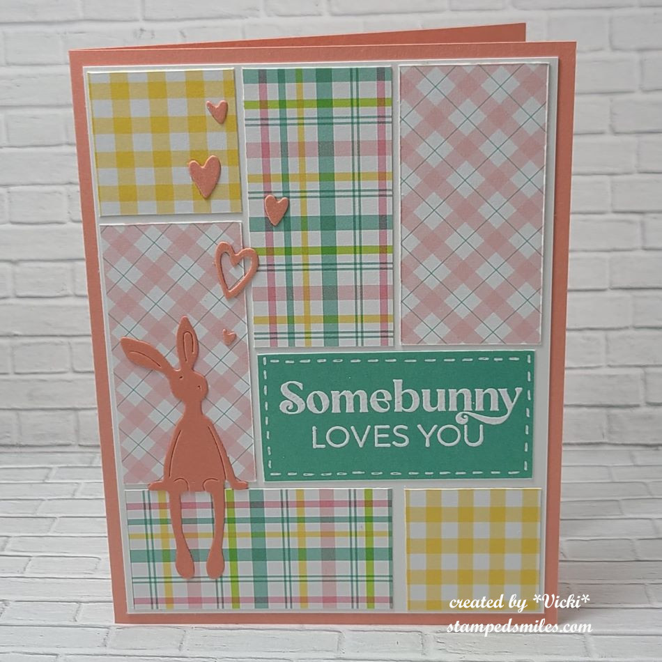 How sweet is that bunny passing out his colorful eggs! I pull out an older card kit (2019) and it had this adorable Simon Says Stamp set called “Bunny Wishes” (no longer available) mixed in with the kit which I don’t think came with it, but I wanted to use it with some of the other items that were in the kit like the papers. It was like getting a brand new order and forgetting what I purchased! 😆