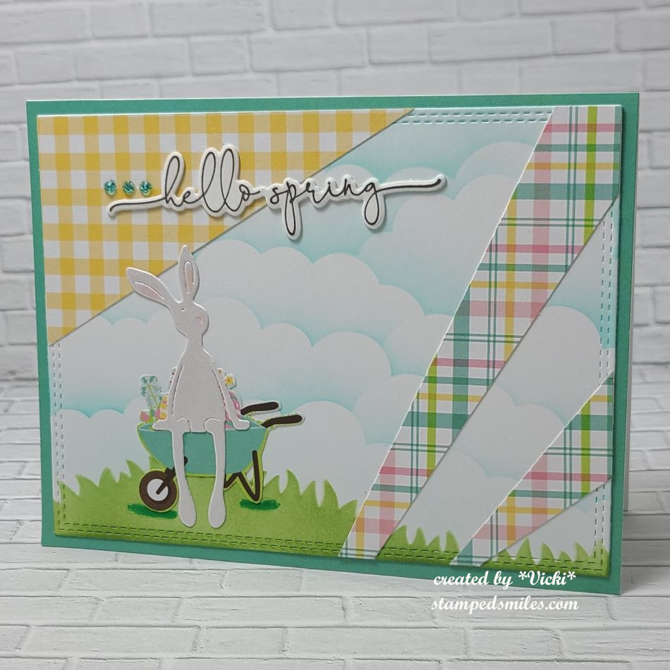 I also used this beautiful oval die (not available) from SSS that cuts the oval, the flowers and the stitching marks around it. I added a border of grass to place at the bottom and then I stamped the sentiment from the set and also stamped the “Easter” greeting on another piece of light blue cardstock cut with a banner die. The gingham background was cut with a double stitched rectangle die and then I used the oval die to cut an opening for the bunny scene. I added foam tape around the edges to pop up the panel on an A2 top folding pink card base.