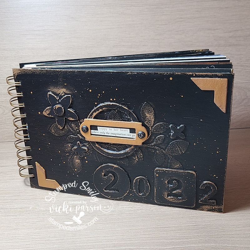 I pre-punch the holes at the short side of the pages each month and then at the end of the year, I use my machine to bind them together to make a book. I add covers and decorate them. There is a post with last year’s book HERE.