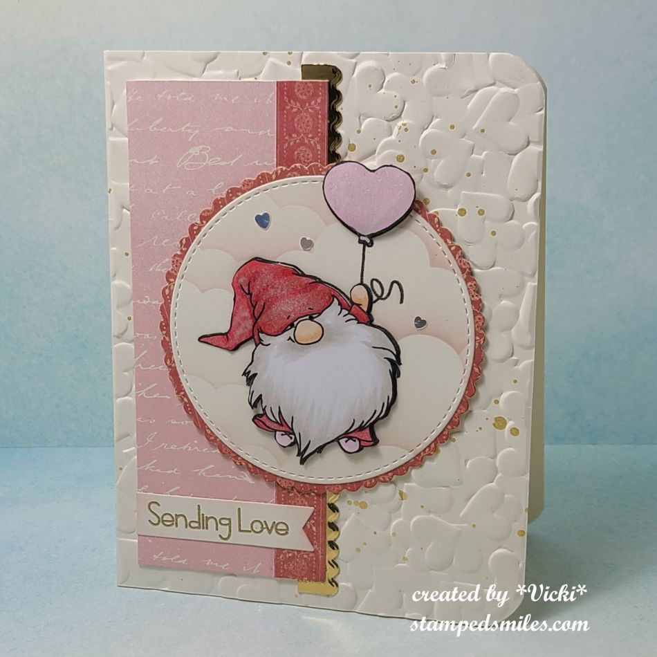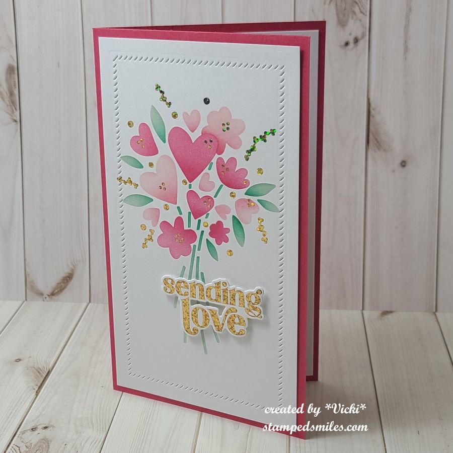 I layered it over a scallop white layer and a green A2 top folding card base. I also white heat embossed the punny sentiment and die cut it out with a stitched banner die. Sponged the edges with green ink and attached to the top right of the heart panel.