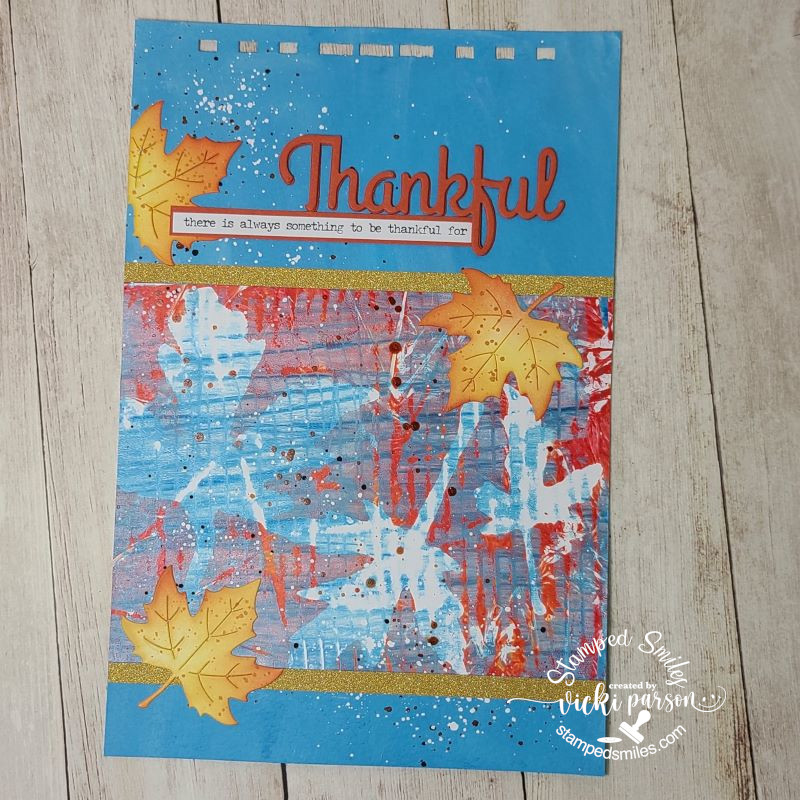 I die cut some maple looking leaves from the Taylored Expressions Garden Variety-Fall die set and ink blended them. I also splattered some orange paint over them as well. I had some gold glitter sheets that I cut down in a couple of thin strips to add to the top and bottom of my gel print piece. I then attached the die cut maple leaves.