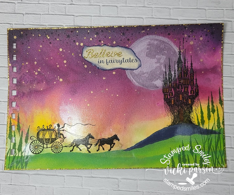 I stamped the Lavinia Stamps “Star Gazers” stamp in black in and fussy cut it out. I colored the rocks they were sitting on as well as their wings and popped them up on the grey ripped border. I also hand drew more rocks around them and used a white gel pen to highlight. I added some glitter to the wings. Lastly, I wrote over black cardstock with a white gel pen, cut them out and attached to the ripped green border. I then used a black pen to doodle around the words.