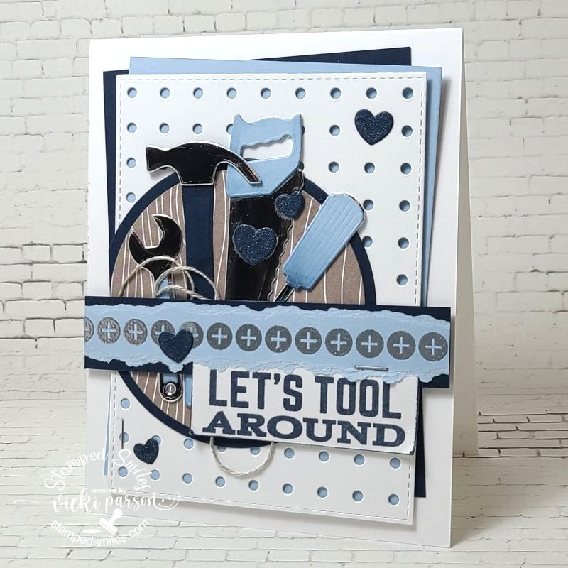 Oh yes…tools! This always seems to be a favorite in my craft supply when creating a masculine card for sure! I made this one for my husband who’s a very handy guy, and he likes the color blue. I always like to add lots of textures, distressing and layers when making a masculine card. This also helps for using more of those craft supplies!