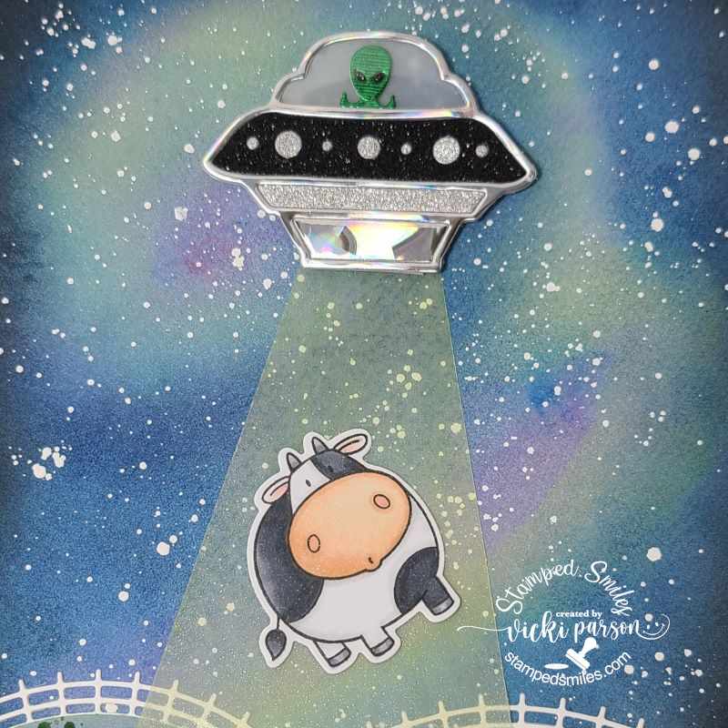 For the flying saucer and alien, I used an UFO die set from Whimsy Stamps and cut it out with several different specialty papers like holographic, silver glitter, green metallic, black glitter, vellum and acetate (for the front window of the saucer). I popped it up with foam tape over a die cut piece of vellum that I’ve colored with a yellow marker and sprayed with shimmer spray…hard to pick up in a photo, but you can barely see it. I attached it over the background by using my Xyron sticker machine, so you can still see through it.