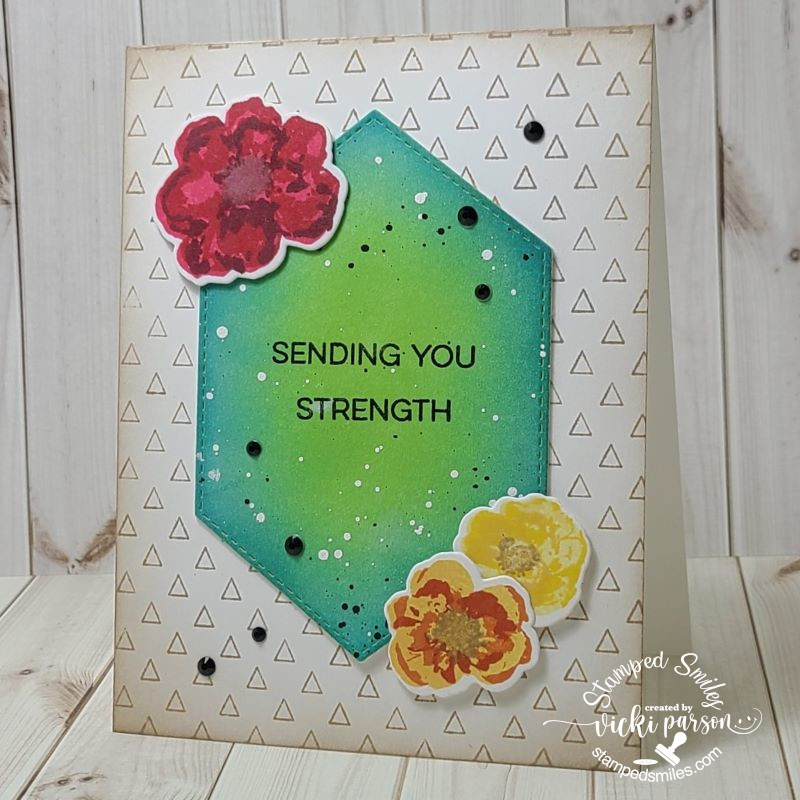 For the A2 sized card base (makes up project parameter), I used a MFT Triangle background stamp (retired) in the same kraft color that I inked the centers of the flowers with. I also used this color to ink around the edges of the card. I than layered two more cut out shapes for the ink blended sentiment panel for dimension and attached to the stamped card base. I used foam tape to pop up the flowers and lastly added some black gemstones (for the black dots parameter).
