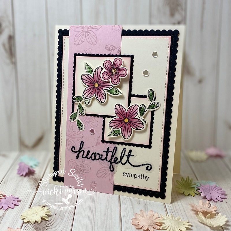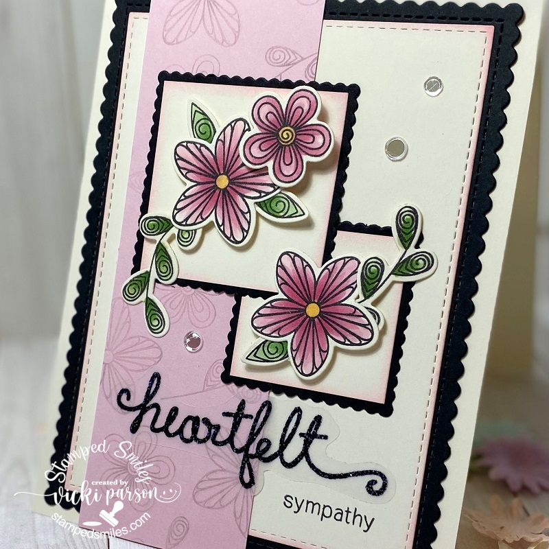 Here are some cards that I’ve actually made a total of 8 similar designs using the large wording background dies from My Favorite Things. I’ve used the “Sending Christmas Joy” and “I Really Miss You” dies for all eight of these, but only after I stamped the backgrounds. I used the MFT Knitted Sweater BG stamp and the Alley Cat BG stamp for a couple of backgrounds before I die cut them. Then I used the die cut letters to place into the other backgrounds on the cards to get that look. So it was like creating 2 cards with one cut and filling it all in. (For the Alley Cat background stamp, I ink blended the background and stamped it as a watermark effect over it and then took the “left over” ink from that to stamp it again to create an additional BG.) I then cut out each of the panels with the MFT Wonky Stitched Rectangle die and placed over a white A2 sized side folding card base. The penguin image is from the MFT Holiday Penguins set and the bird on the other one is from the MFT “Tweet Holidays” (Not found in store.)