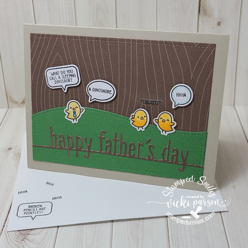 So, when I saw this Dad Jokes stamp set from Lawn Fawn, I knew it would be a good one to have on hand for cards with him. I kept this card a simple one with a grassy stitched border and then I used one of those woodgrain papers from Lawn Fawn and also die cut the LF Father’s Day Border using the same woodgrain paper for it.