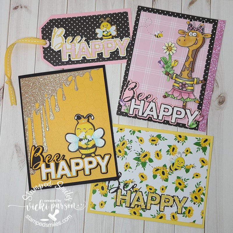 For my projects, the giraffe was the only pre-cut image to color. All of the other bee images came from the papers that were included with the kit that you were to fussy cut from. Since the sentiment die was also included, I die cut all of those pieces for my card too. I decided to step-up my cards with some glitter cardstock along the edge of the giraffe card and then I die cut the “gold glitter honey drip” on that card from the Riley and Company Corner Goo Die. I also added little details like the “flying trail” of the bee with a marker and using a glitter brush pen on the bee wings.