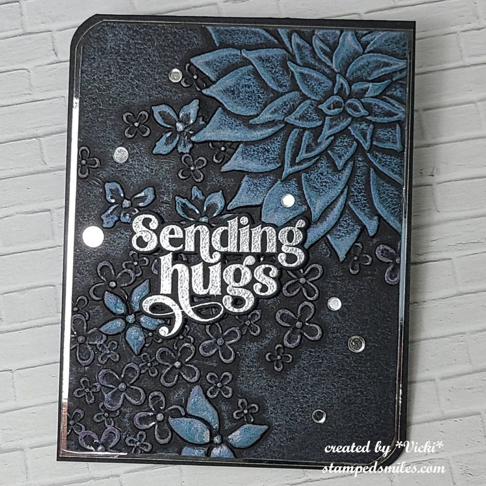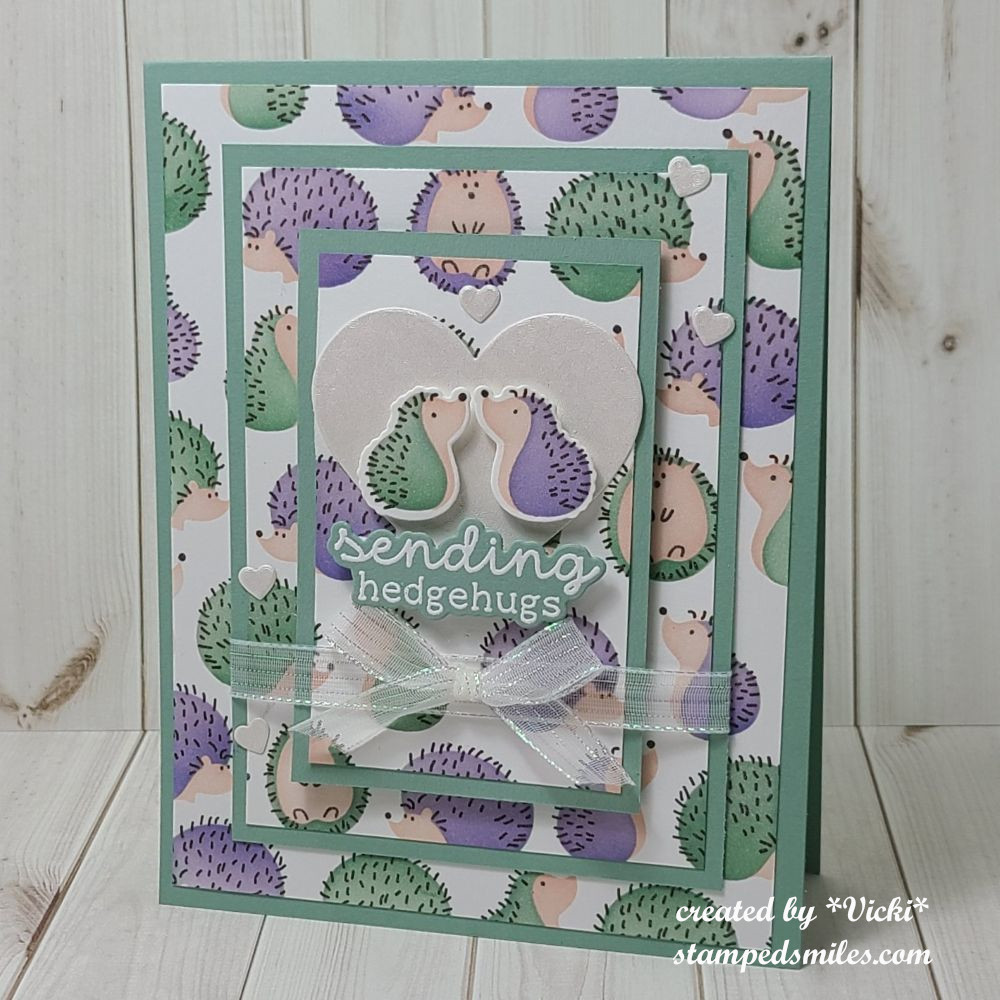 I layered it over a scallop white layer and a green A2 top folding card base. I also white heat embossed the punny sentiment and die cut it out with a stitched banner die. Sponged the edges with green ink and attached to the top right of the heart panel.