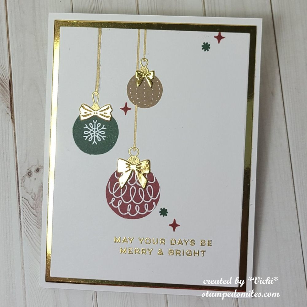 I pulled out this cute Scrapbook.com stamp set called “Holiday” to create a simple design with the solid bauble images and added a few heat embossed elements over two of them and then heat embossed a hook for each. I heat embossed the sentiment in gold to match the hooks and then just stamped a couple of doo-dads around the panel and drew lines from the ornament hooks coming off the edge with a gold fine line pen. That’s pretty much it! I did die cut a few “Mini Bows” from Taylored Expressions for each ornament. Then I layered the ornament panel onto gold and then onto a white A2 card base.