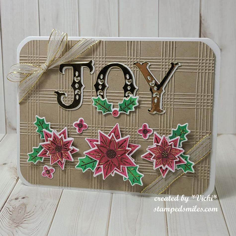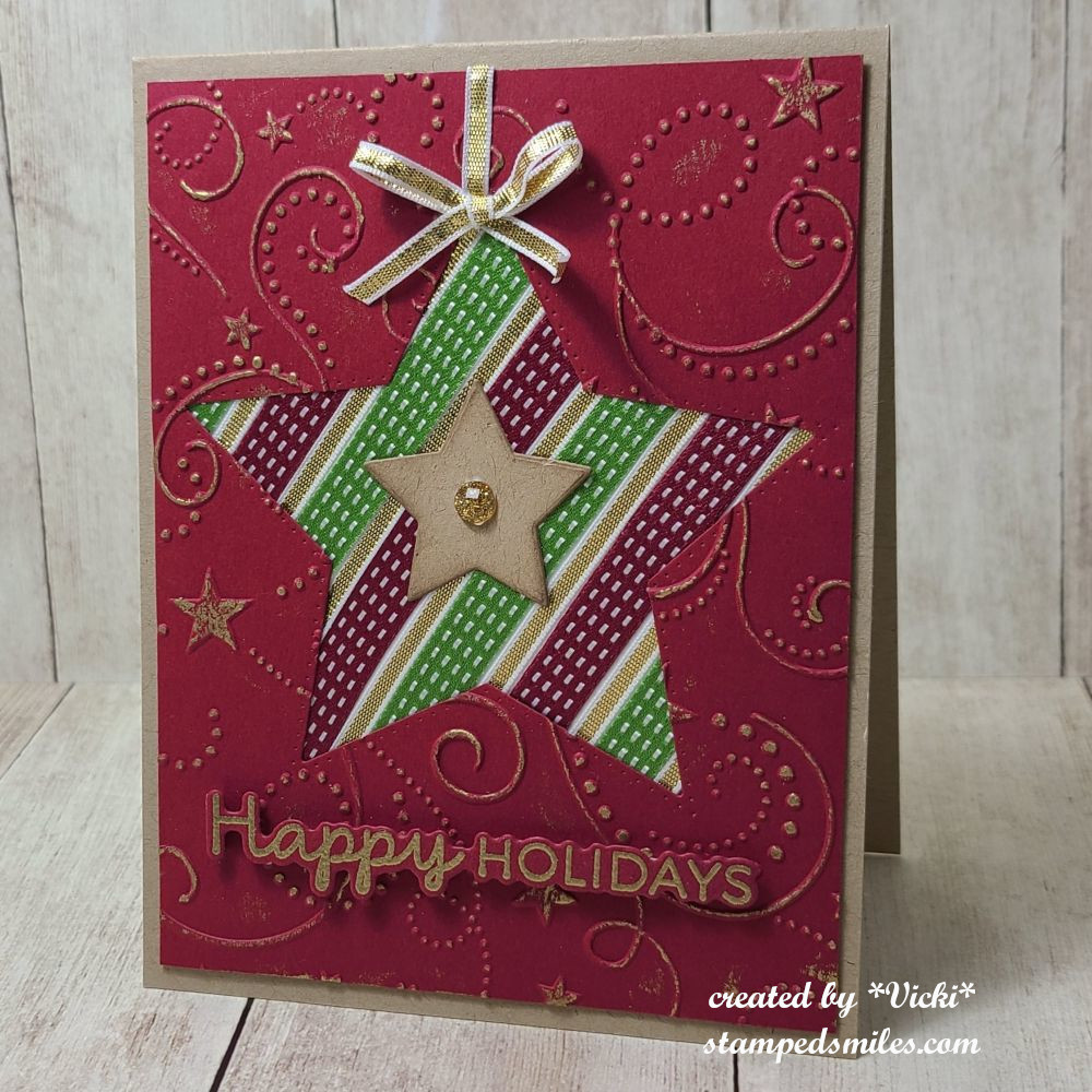 I die cut a smaller star in kraft cardstock for the center of the star opening and added a gold gem in the center of it. I also took the thin gold ribbon and attached it from the top of the star around the red base and then added a bow above it. Lastly, I just gold heat embossed the sentiment, die cut with the coordinating die and popped it up under the star with a foam strip.