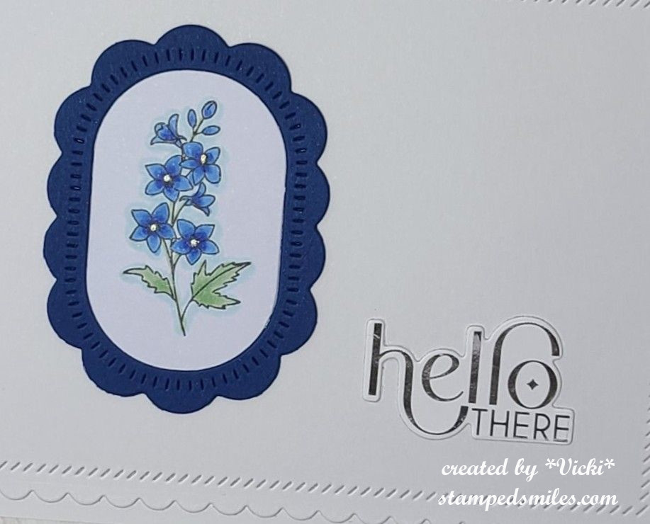 The flower image is actually the July “freebie” from Taylored Expressions when you place any order with them.  I quickly colored it up with Copic markers and then die cut the panel out with the TE Petite Scallop Gallery Builder die set and cut out another panel for the scallop frame around it with TE Blueberry cardstock.