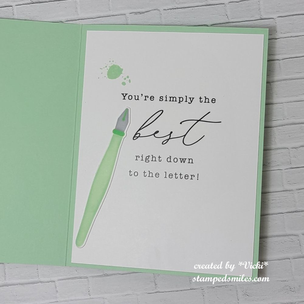 Here’s the inside of my card where I used one of the Just Write-Insiders panel for my card and included the stenciled pen and stamped an “ink spot” all included with the card kit.