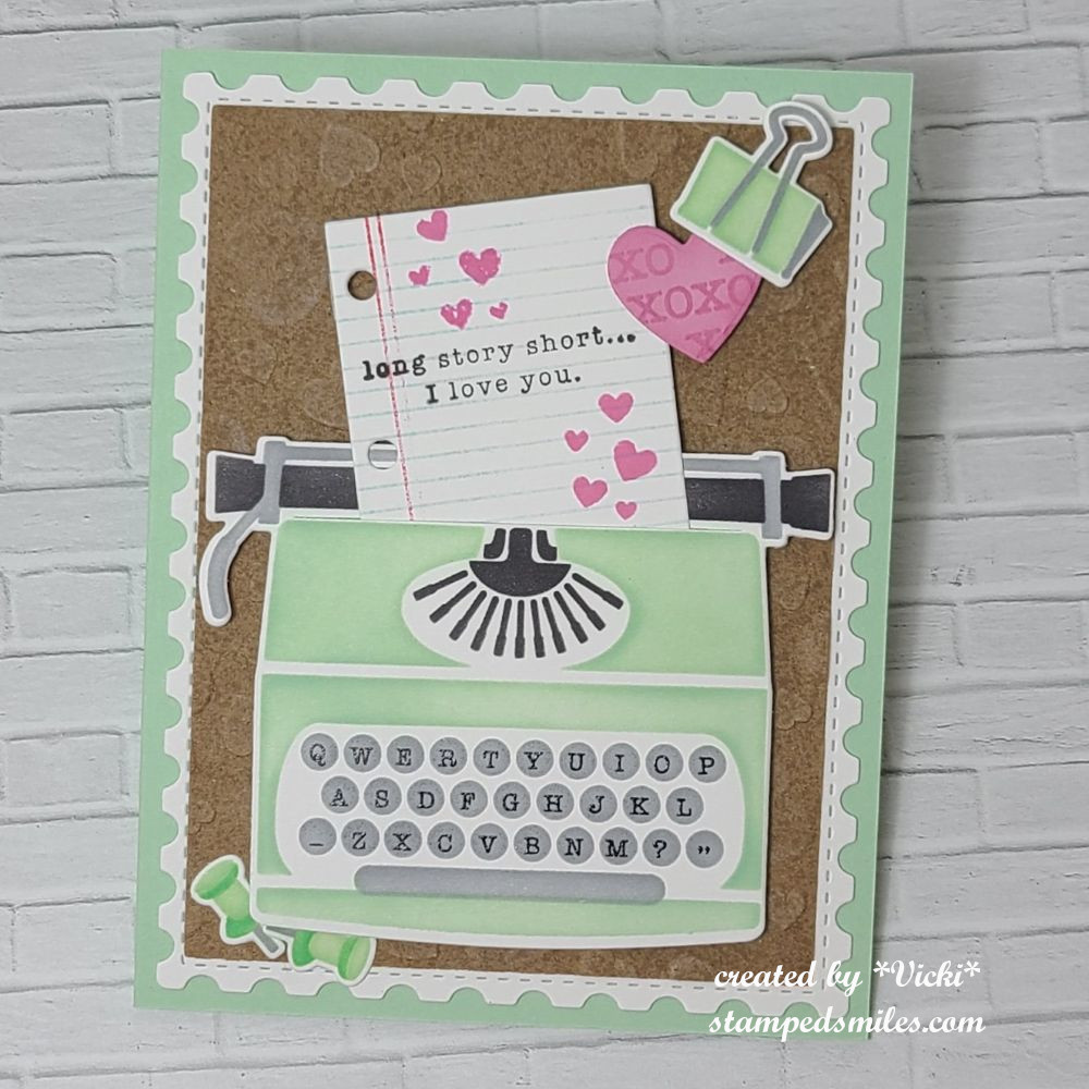 I fell in love with Lori Craig’s card including the colors of it, so I wanted to duplicate it!  I didn’t have everything she used in hers, but I like how it turned out!  The background was done with a 3D Lots of Love embossing folder over a stamped cork background.  I swiped white ink over the popped up hearts to try and bring them out a bit more.  The lined notebook paper inside the typewriter came from the TE Love Letters Clear Stamp & Die combo which is also where I got the “XOXO” to stamp on the heart at the top.  I also used the hearts from this set to stamp on the notebook paper.