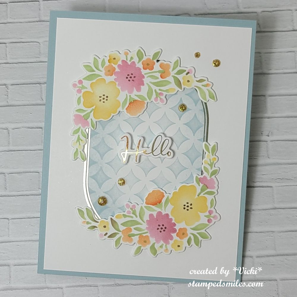 After foiling, I pulled out the TE Masking Stencil-Framework (coordinates with the foil panel) and used it to stencil the center oval with the TE Mini Slim Stencil-Trellis in light blue ink.  I then took the left over ink from the blending brush and lightly went over the entire inside oval shape.  On a separate piece of white cardstock, I stenciled the TE Cottage Charm Stencil & Die Combo and attached the floral spray on each opposite ends of the foil oval.  I was trying to go for Autumn style colors for the flowers, but the red tone looks a bit more pink in the photo now that I’m looking at it.  I still like it though.