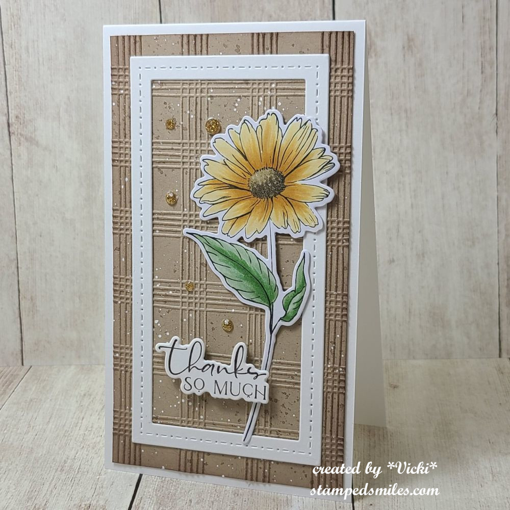 I thought I’d try out a mini slim sized card for this one and the tall larger flower was a great fit for it!  I used the Taylored Expressions Natures Canvas Card kit (no longer available).