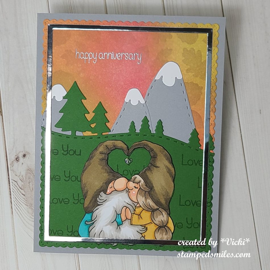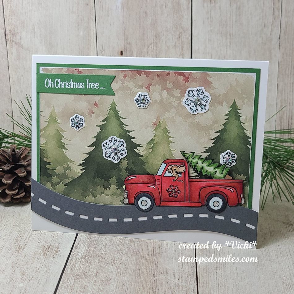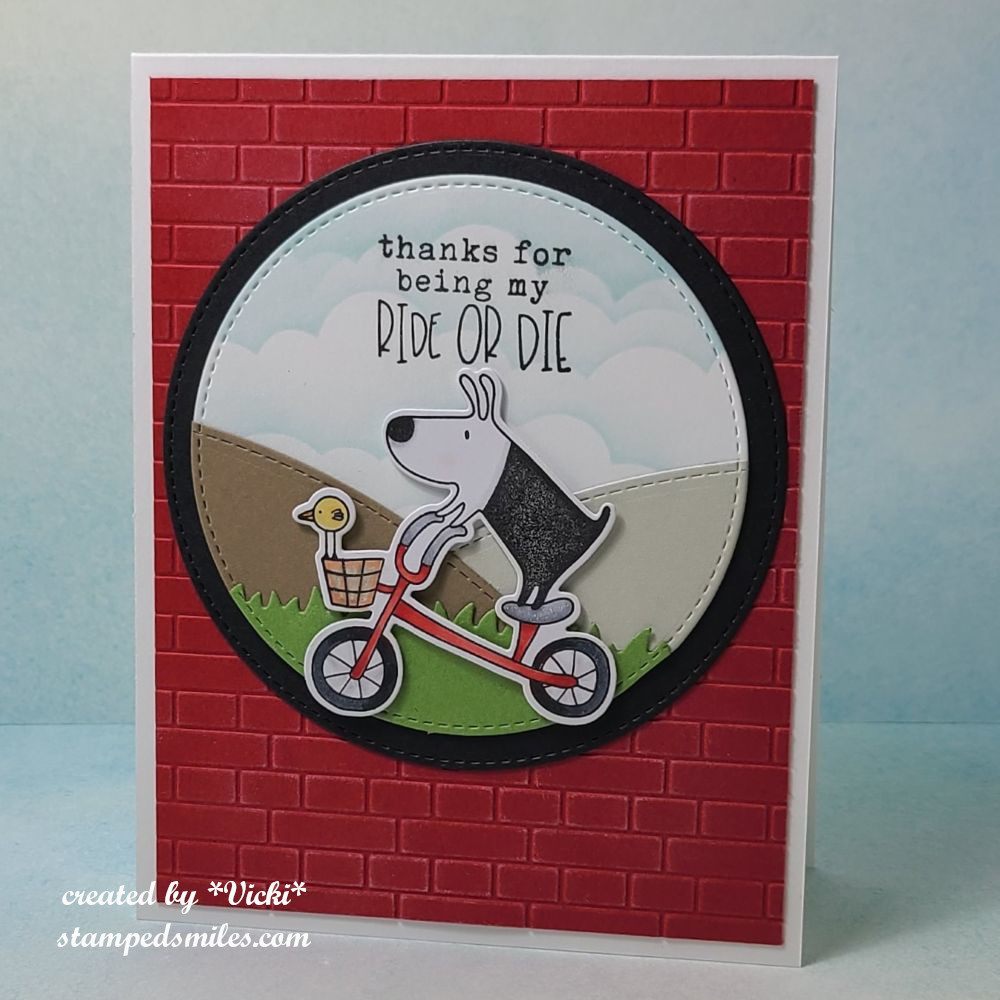 I kept my scene in a circle and added some clouds in the background that I stenciled in and then layered some hills/slopes and a grass border on the front. I just popped the “ride or die” sentiment at the top and attached the die cut image with foam tape. I layered the scene onto a black circle base that was attached to a red brick embossed background. All was attached to a top folding A2 white card base.
