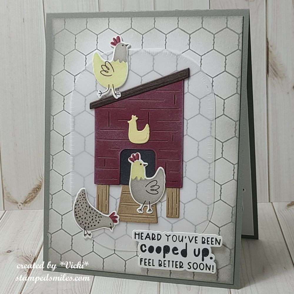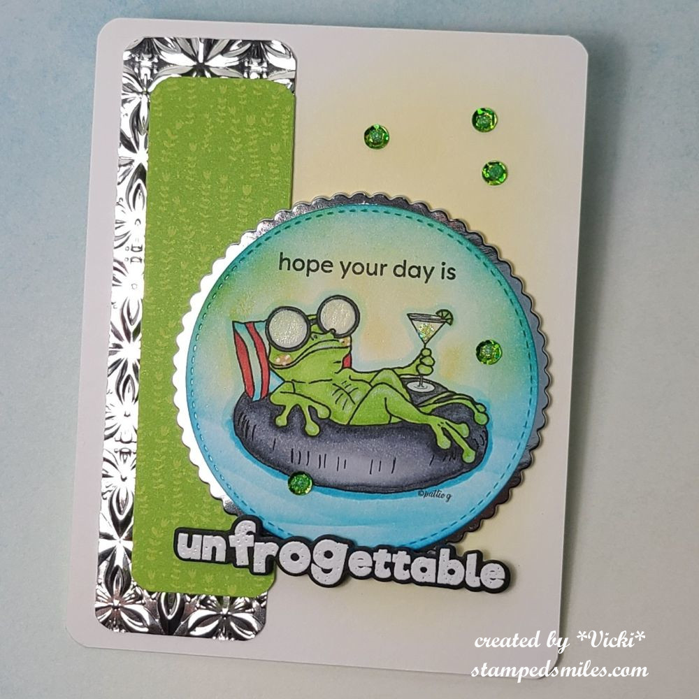 I layered it over a scallop white layer and a green A2 top folding card base. I also white heat embossed the punny sentiment and die cut it out with a stitched banner die. Sponged the edges with green ink and attached to the top right of the heart panel.