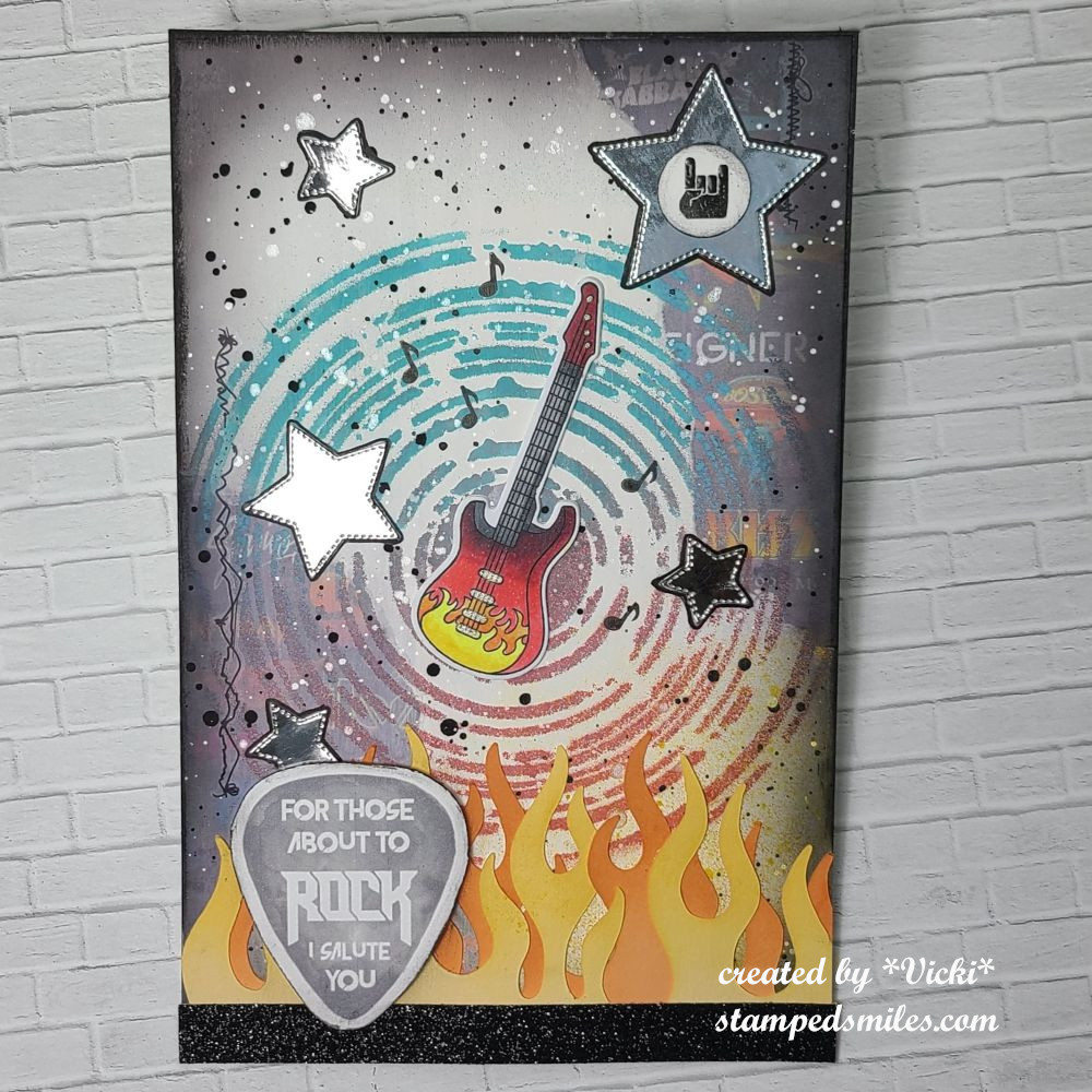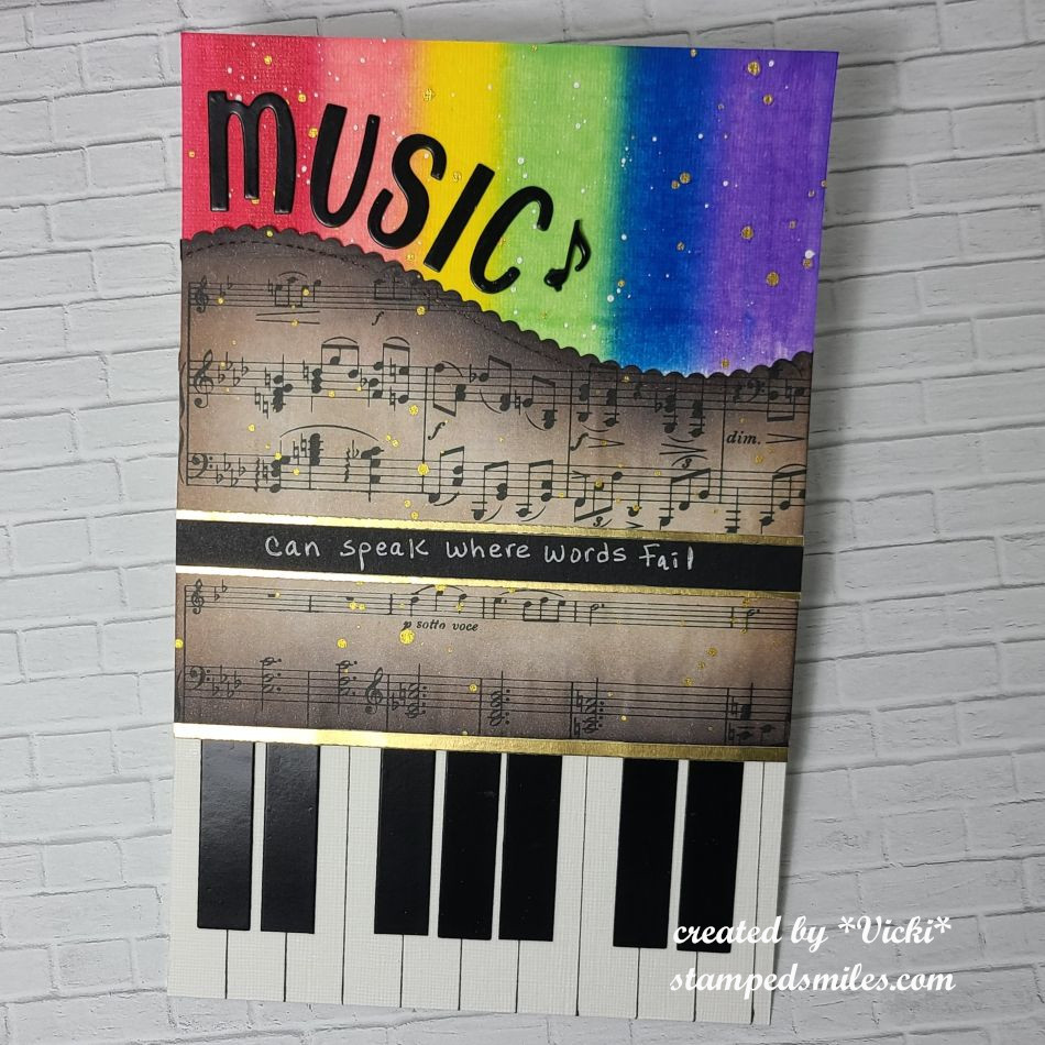 More layers over the background: I used older Tim Holtz stamps to add some texture by stamping brown ink, then I used an old TH stencil and some yellow paint for the “sun rays” around the hill with a sponge to apply it. I also used a sponge with white ink to stencil over another stencil in areas and lastly, I stamped some musical notes in silver ink in a few places.