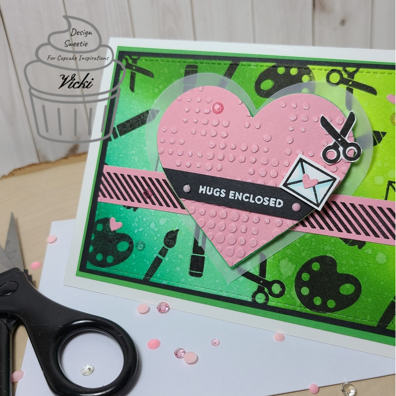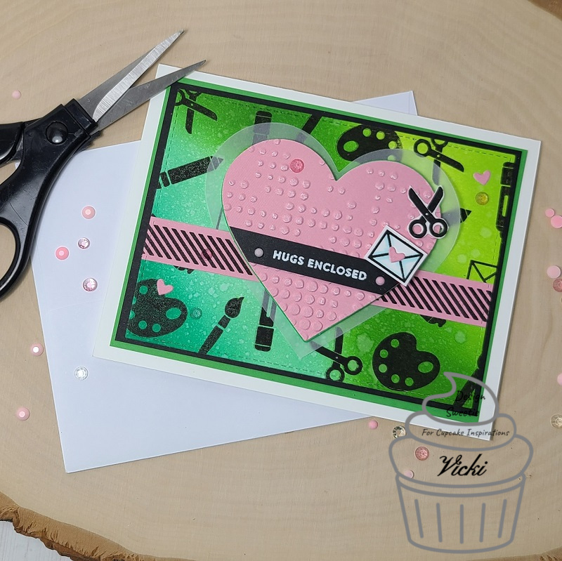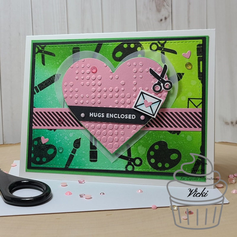 I did white heat emboss the sentiment from the stamp set over the black strip on the heart. I used just a set of Hero Arts Inifinity Heart dies to cut out the pink heart and another will vellum behind the heart and pink strip. The pink heart was popped up with craft foam and so was that little envelope over top of it. I did run the pink die cut heart through a Tim Holtz embossing folder and rubbed some white ink over it.