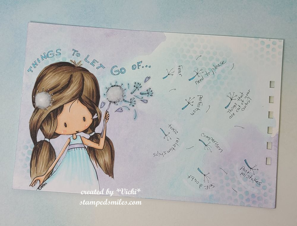 For that cute little girl that I found on my computer from Tiddlywinks, I printed her out rather large to fit on my page and colored her with Copic markers. I printed an additional image over a piece of vellum and cut out the dandelion seeds and hearts and attached that portion to the girl image I colored. I did this so that you could still see the background. Once I’ve attached her to the page, I cut a piece of cotton ball and glued it to the dandelion weed and the one in her hair. (Cotton is pretty light!)