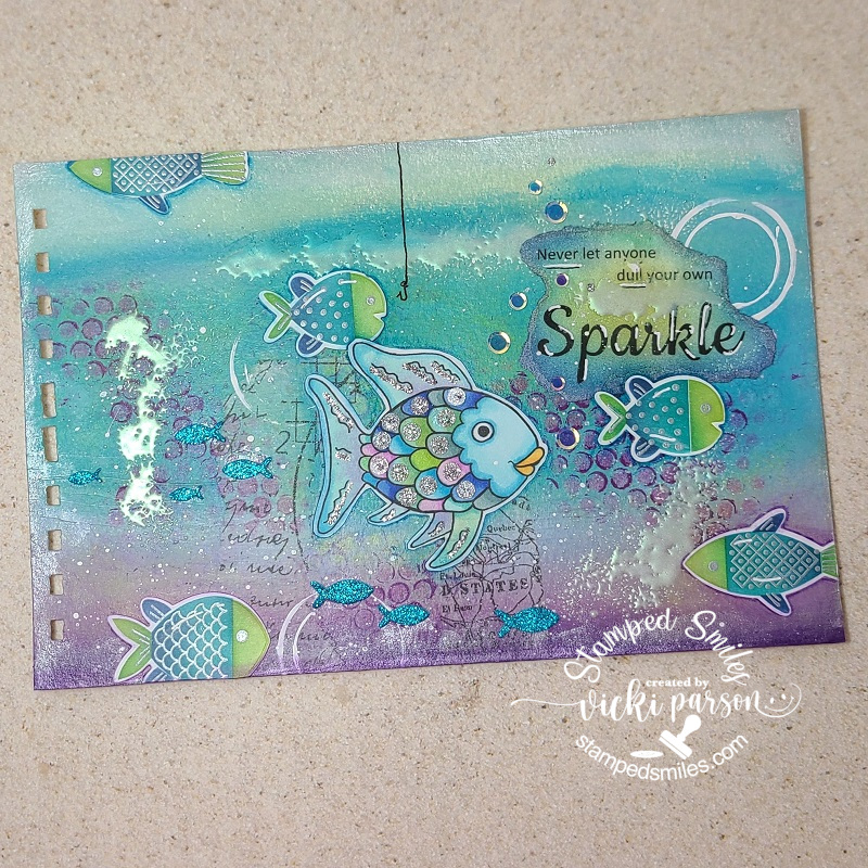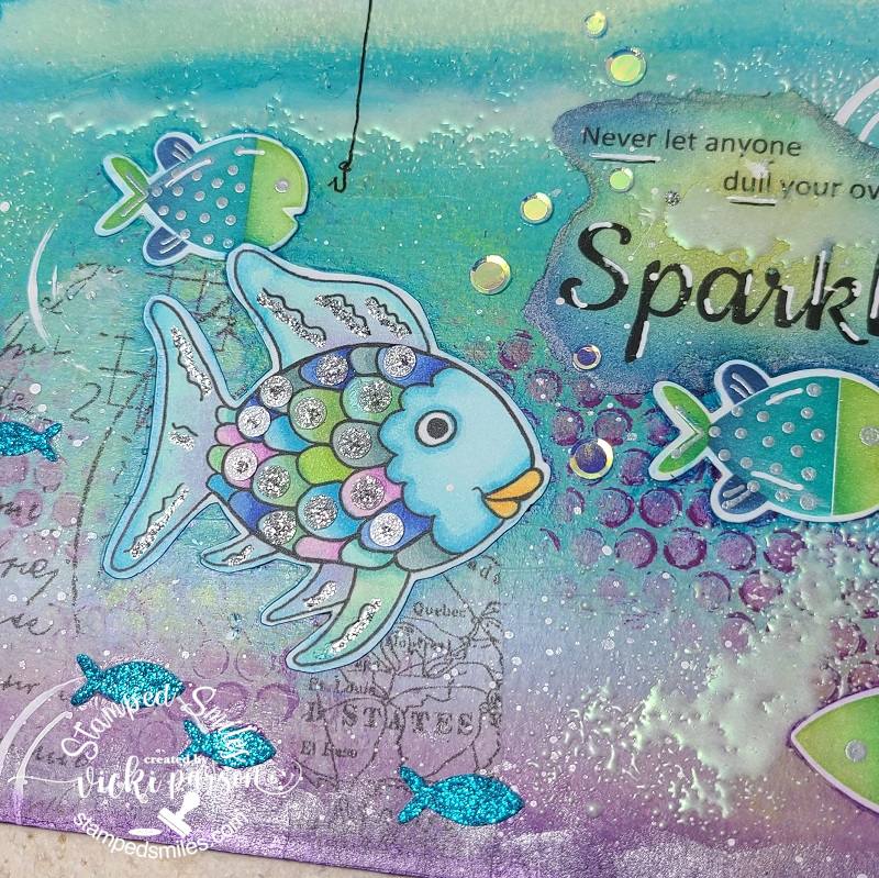 I’ve used the Picket Fence Tree Bark stencil over kraft on the background and then splattered it with brown and white paint. The leaves under the bug and the accent came from the Lisa Horton Variegated Leaf EF+die that I cut over light green cardstock. I used some metallic green wax to go over the details in them. I also used some gel pens to make some doodles around the strip, the circle and under the sentiment along with following a sketch. (details below) You will also notice more sparkly gems! I’m also entering this in the Inky Stamper FB challenge this month which is using an IS bug image.