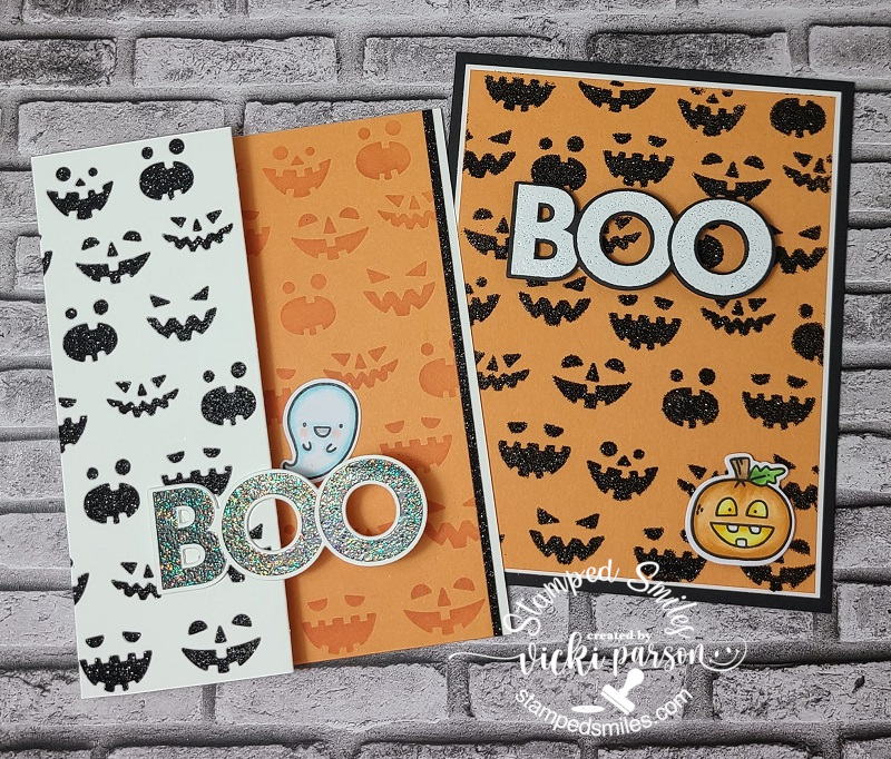 For the set of mini slim cards, I did pretty much the same style as the purple, but for the “boo” sentiment I used the TE Boo Script + Backer and die cut 2 of the sentiments with black cardstock and then heat embossed it with the black glitter EP. I placed it over the vellum die cut backer and attached to the card front. I popped up the ghosts and the sentiment strips with foam tape.