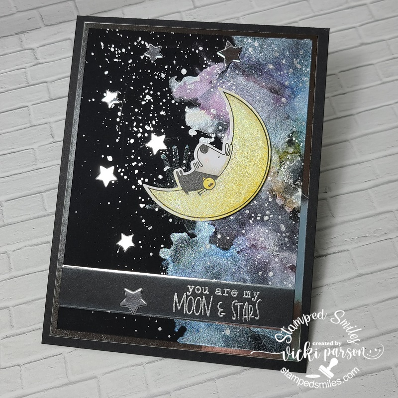 I think this one turned out cool using the Inky Stamper Alien stamp set! I have my alien (which is my “movie” element parameter) colored up with pencils and cut out with the die. I stamped the molecule (which is my “building blocks” random parameter in red ink over a piece of Doodlebug graph paper. I sponged the edges of this piece with some grey ink before attaching it to the bottom portion of the card. The sentiment also came from the same stamp set that was white heat embossed over black and cut out with a banner die and popped up with foam squares.