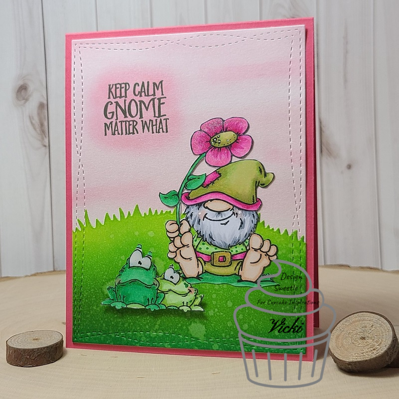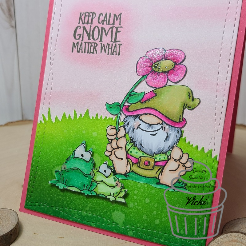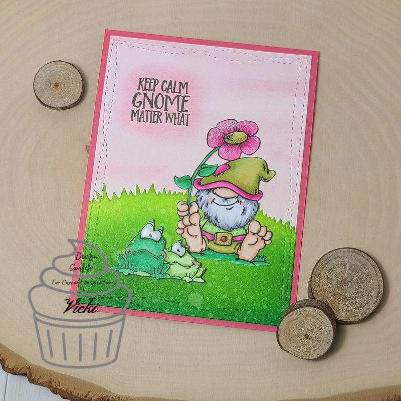 I think this turned out pretty cute! I dug into my Whimsy Stamps stash and colored up these cute gnomes and fussy cut them by hand to add to the scene. I cut off the string and heart in the center of their hats and stamped the image over the green cardstock with the cut out image layered over top of it.