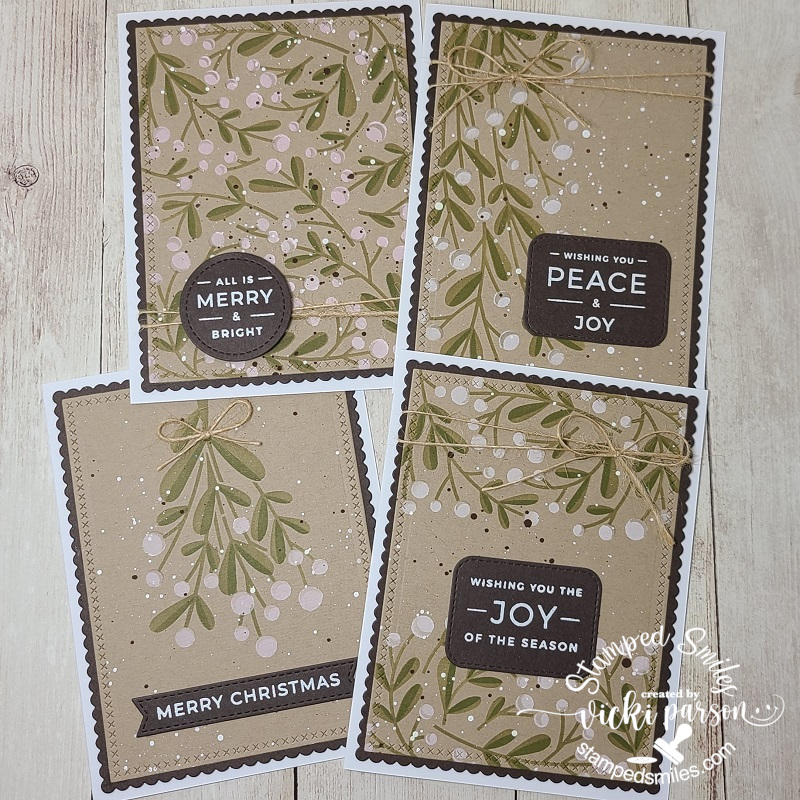 And here is the other set of four cards that I made using the Toffee colored cardstock with green and white inks for the stenciling.  I’ve also splattered these with brown and white paint.  The sentiments were white heat embossed over some TE Chocolate Truffle cardstock and cut out with some MFT dies.  Before attaching to the pre-made white A2 card bases, I also wrapped some twine around some of the panels or added a bow with it. (I love the homespun look of the white mistletoe!)