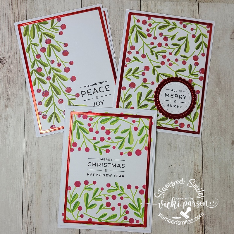 I have already sent out my Christmas cards, thank goodness, as I wasn’t even sure that was going to happen either!  I was very impressed with the new Taylored Expressions Create-in-Quads Mistletoe Layering Stencil and how quickly I was able to knock out 4 card panels at a time, which was a huge time saver to get my Christmas cards finished up!  There is actually a set of 4 designs here (like shown below), but I was in the middle of addressing the cards and forgot to photograph some before shoving into envelopes! LOL This set was using the white cardstock with the green and red colors which turned out very pretty.  I also used the red glitter paste for the highlights on the berries.