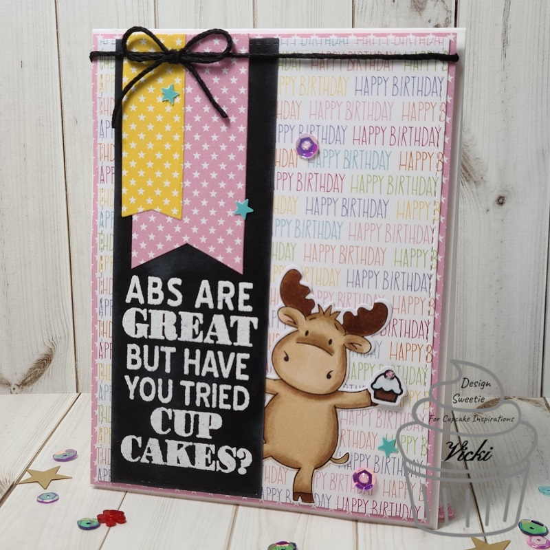 Today I thought it would be fun to create a unique card with my friends for {Cupcake Inspirations} as well as another of an old favorite from our sponsor Riley and Company that was also featured for yesterday!  I have loved this adorable moose for many years and so I couldn’t help but use another image to create something for a little chuckle….