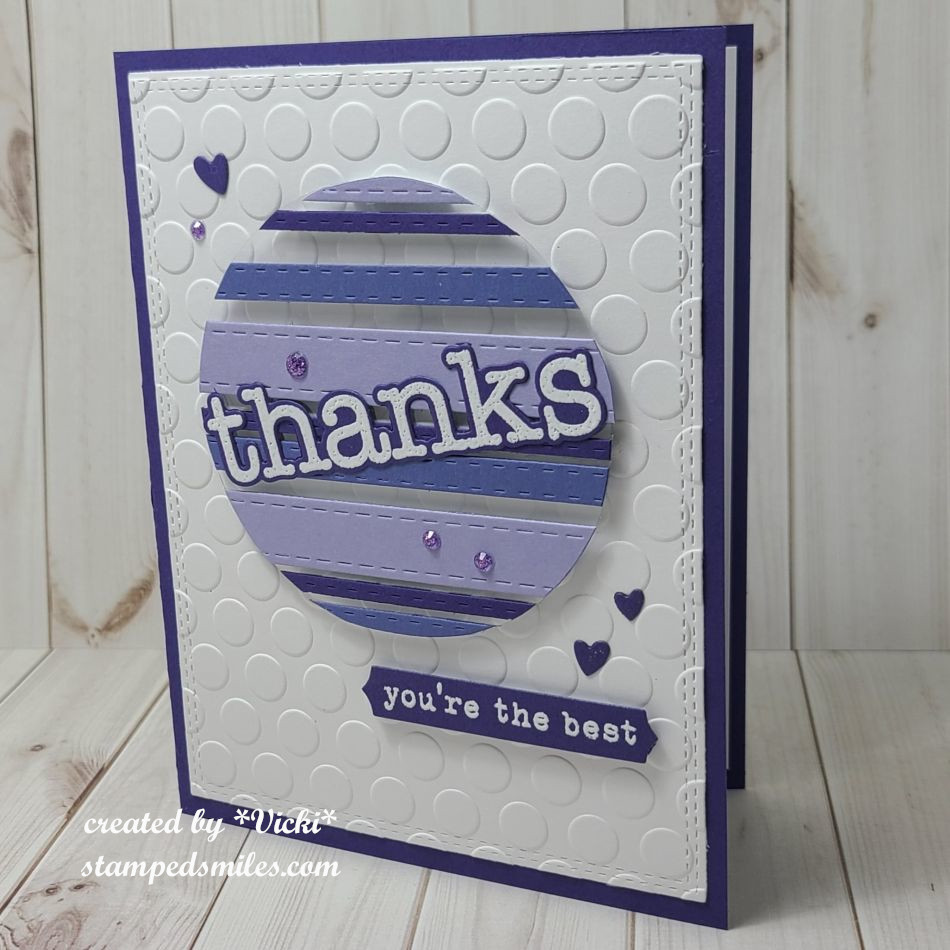 The “thanks” sentiment and strips were white heat embossed over the Eggplant color and cut out with the coordinating dies. The little hearts were also apart of the die cut. I then added some purple color rhinestones to finish it off.